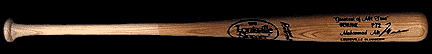 Item#: 6513-8 Special Limited Edition pro-Model Louisville Slugger bat commemorating Muhammad Ali. Imprinted with "Greatest of All Time, Muhammad Ali", limited to just 94. Autographed by Ali. $1,500.00 ($34.95 S/H) |